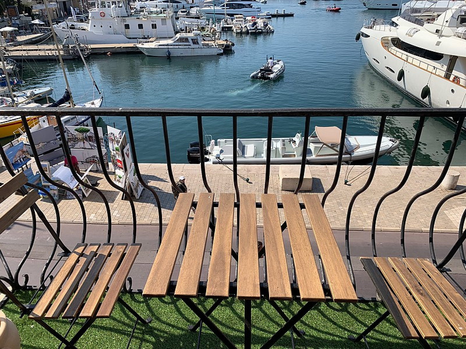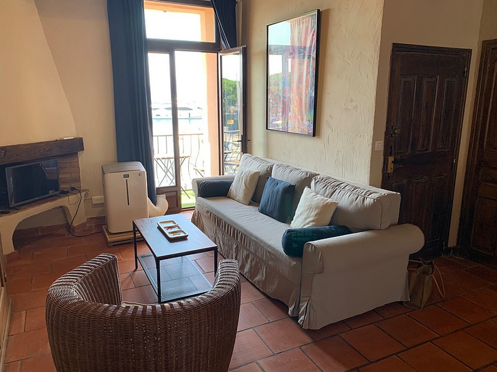 Studio sur le port de Saint-Tropez : Séjour, Cuisine équipée, Coin nuit, Salle de douche – Terrasse sur le port.