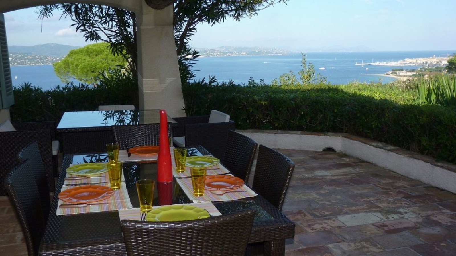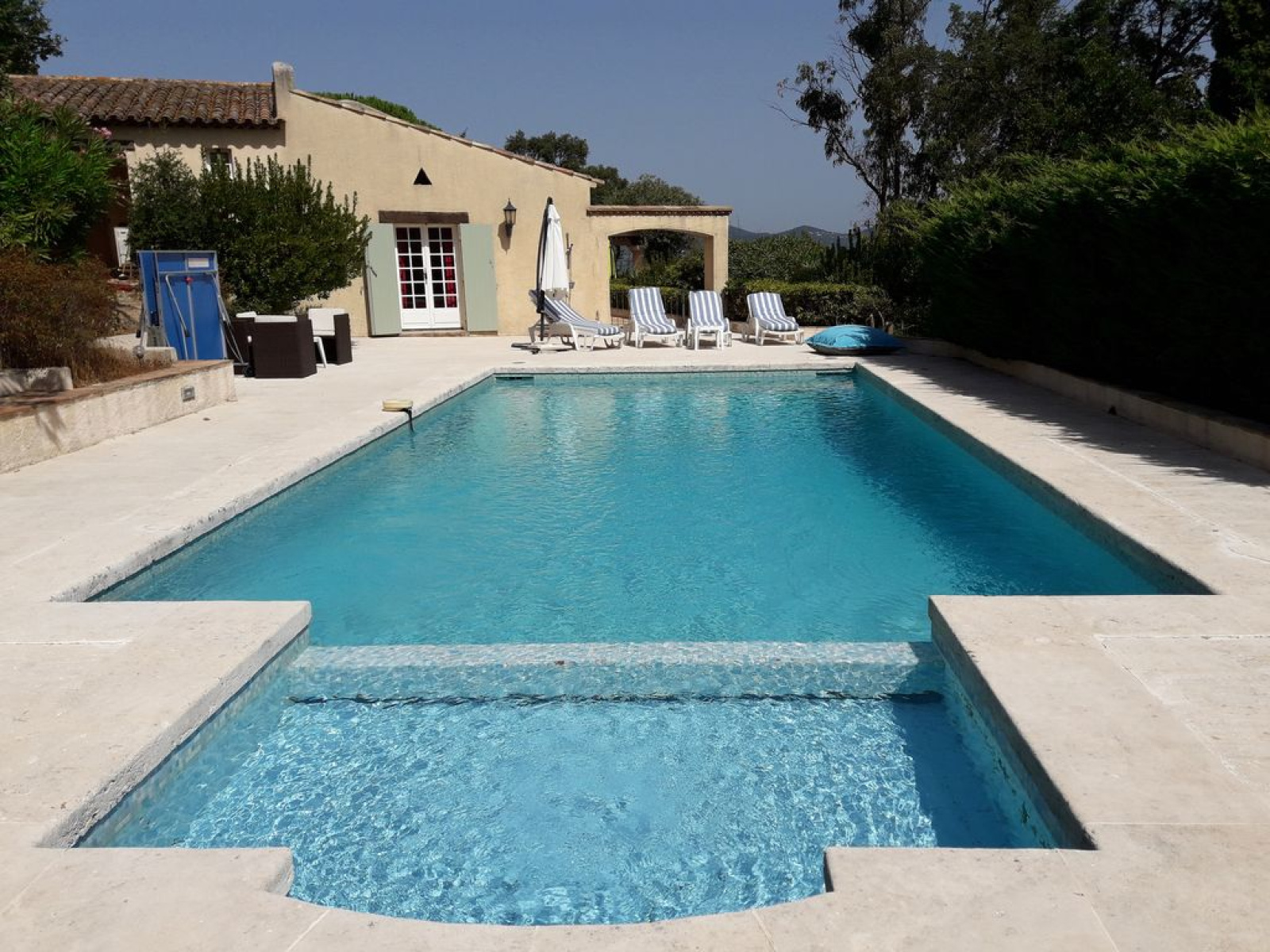 Magnifique vue sur le Golfe de Saint-Tropez, pour cette maison familiale : Grand Salon, Salle à manger, Cuisine équipée, Terrasse avec vue exceptionnelle, 3 Chambres climatisées, 1 Salle de bain et 1 Salle de douche - Piscine 10x5 m, Garage.