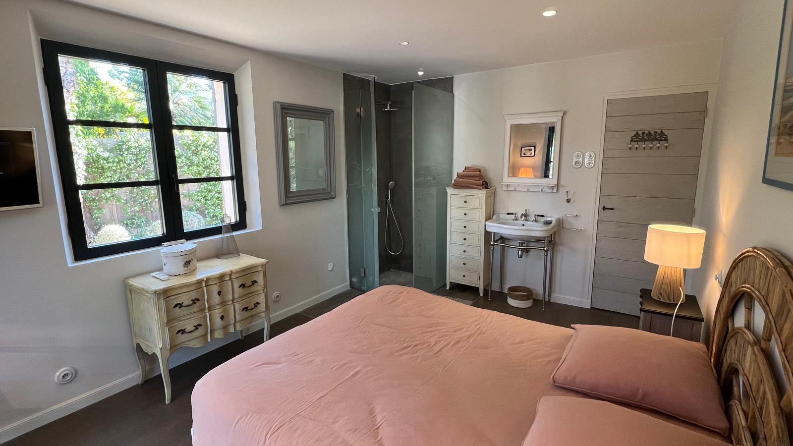Située dans un domaine calme à 3 km de Saint Tropez, cette villa se compose de : vaste Salon / Salle à manger, Cuisine équipée, 1 Chambre ouvrant sur Jardin avec baignoire et lavabo, 1 Chambre ouvrant sur jardin avec douche et lavabo, Toilettes indépendantes, 1 Chambre de maître ouvrant sur Terrasse avec baignoire, douche et toilettes - Accès à l'étage par ascenseur ou escalier extérieur, 2 Chambres ouvrant sur Balcon avec douche et toilettes, 1 Chambre avec douche - Piscine miroir 12x4m, Parking 2 voitures.