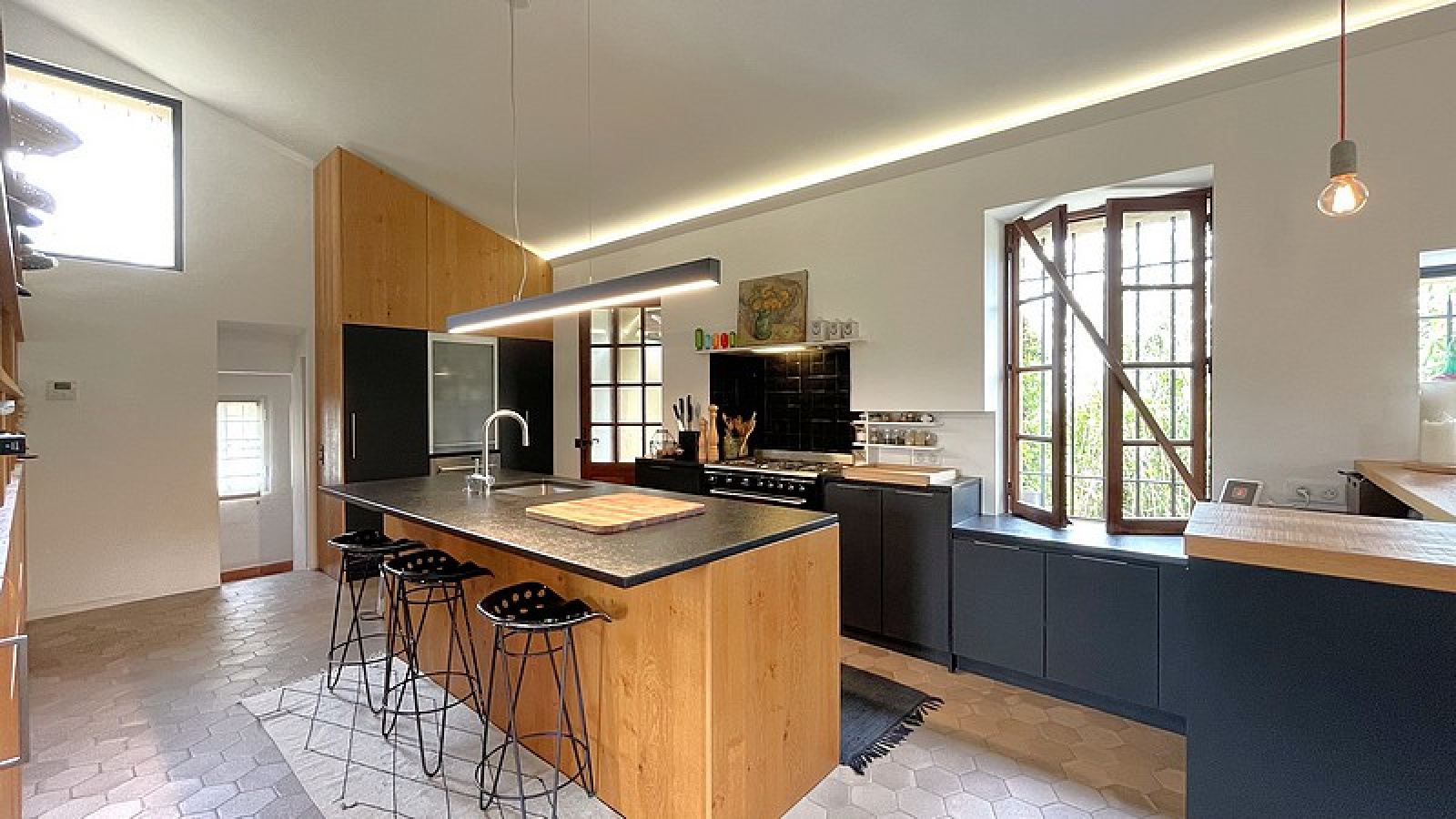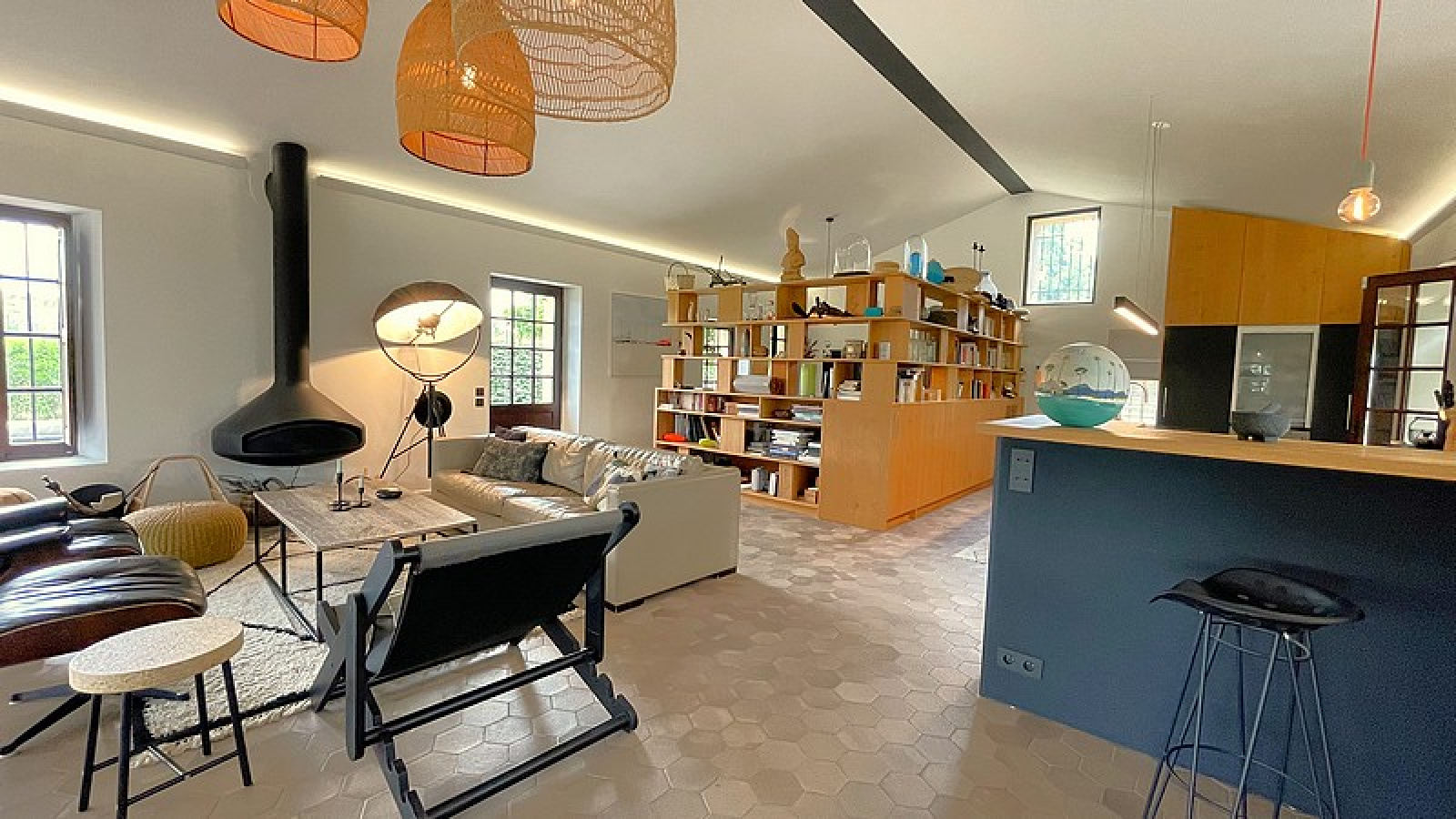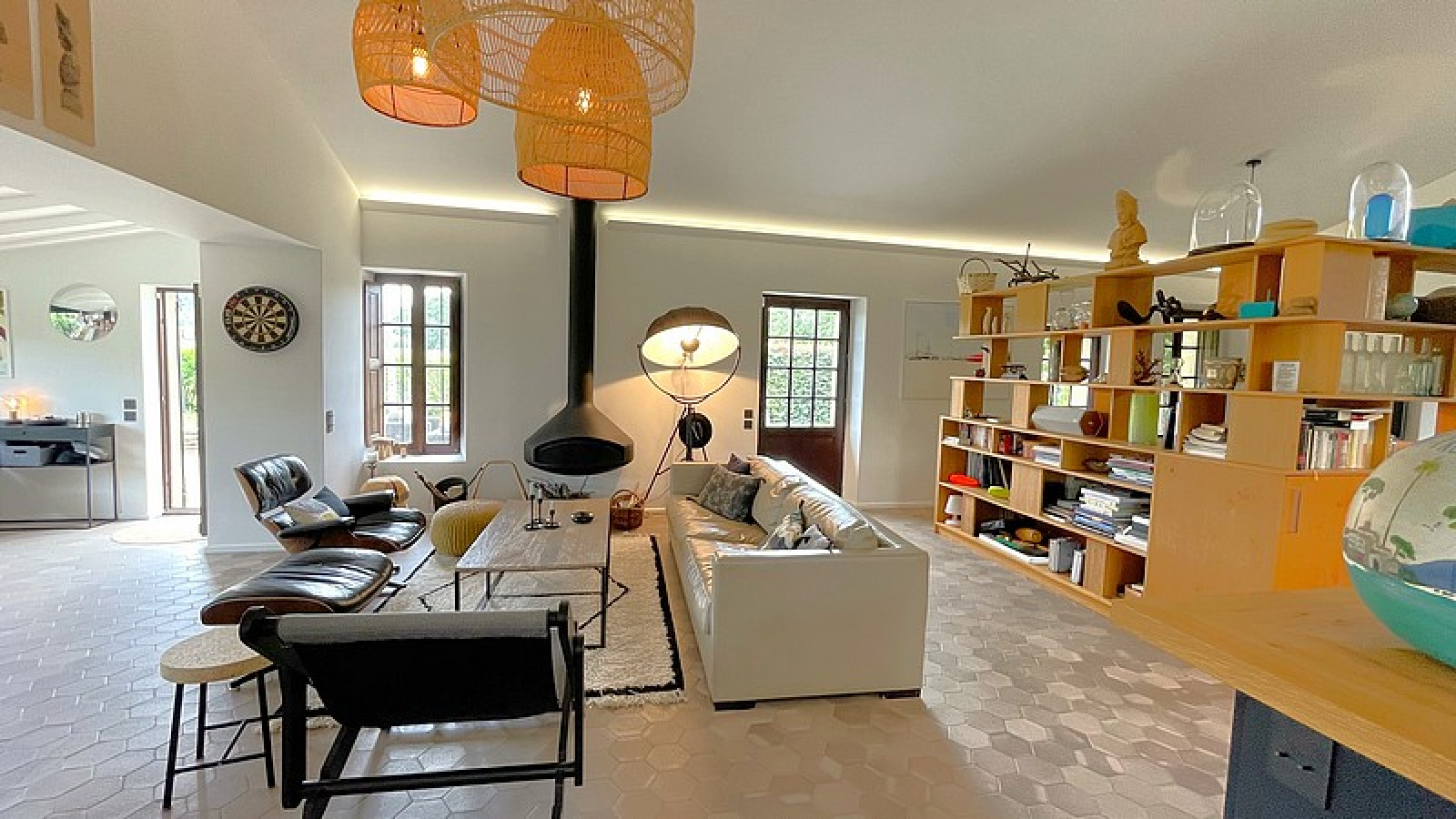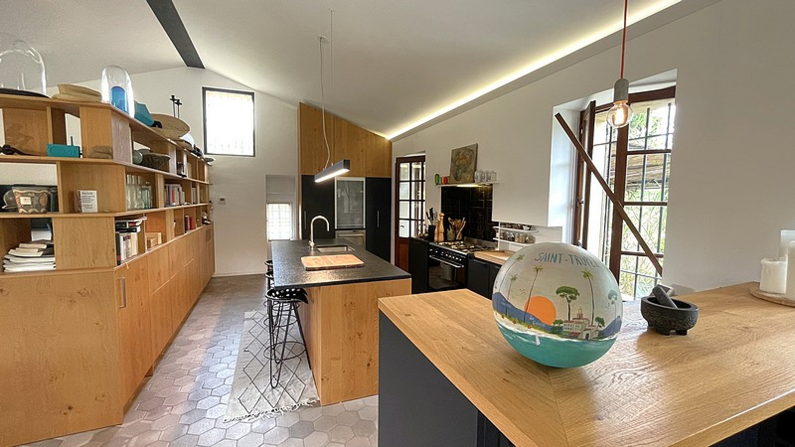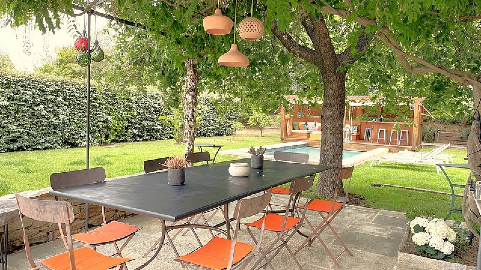 Entrée, Salon Salle à manger climatisé, Cuisine équipée, Toilettes invités, 1 Chambre de Maître climatisée avec Salles de bains et douche, 2 Chambres avec Salle de bains ou douches – Piscine, WiFi, Terrain de pétanque, Portail électrique.